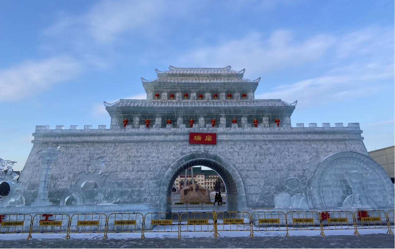 真冰雕刻而成的《盛世中華》冰雪景觀城樓矗立在文化廣場(chǎng)