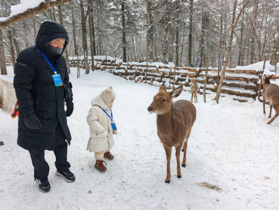 行至景區(qū)中心處的“粉雪部落”,濃郁的東北風(fēng)情撲面而來(lái)!爸侨⊥⑸健敝黝}場(chǎng)景成了最熱鬧的打卡點(diǎn),歡聲笑語(yǔ)不斷。鹿園里,孩子們輕輕撫摸馴鹿、喂食苔蘚,體驗(yàn)著與森林精靈親近的樂(lè)趣!霸谀戏綇臎](méi)見(jiàn)過(guò)真正的馴鹿,這種體驗(yàn)太難得了”,來(lái)自云南的段先生一邊錄制視頻,一邊準(zhǔn)備向家人“炫耀”這份難得的美好。