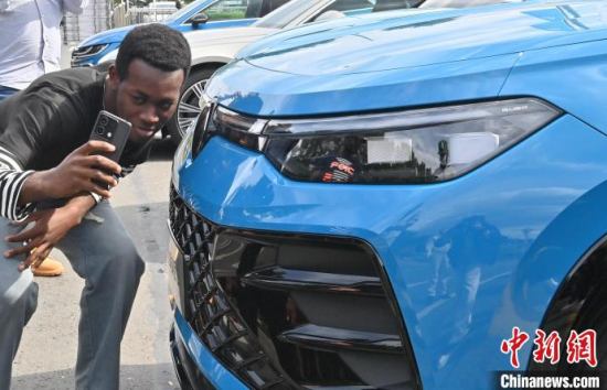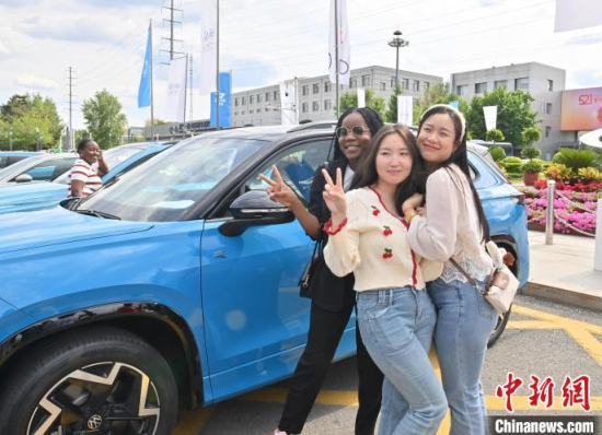 5月23日,吉林長春,留學(xué)生在和汽車合影。當(dāng)天,二十余名留學(xué)生走進(jìn)一汽-大眾長春生產(chǎn)基地,近距離感受中國汽車制造業(yè)的智能化發(fā)展。中新社記者 張瑤 攝
