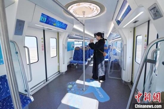 3月21日,全球首列氫能源市域列車在長春進(jìn)行時(shí)速160公里滿載運(yùn)行試驗(yàn)。圖為列車車廂內(nèi)部。中新社記者 張瑤 攝