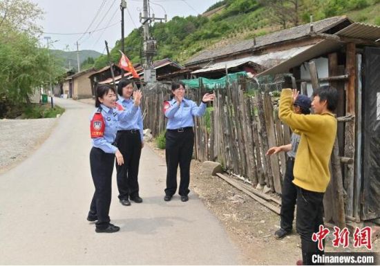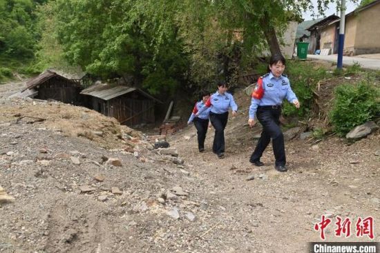 “女子警務團”來到村里走訪。崔藝琳(右一)說,轄區(qū)里很多村子道路難行,但從沒阻止她們前行的腳步!埇 攝