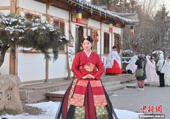12月2日,在吉林省延邊州延吉市中國朝鮮族民俗園內(nèi),游客身著朝鮮族服飾拍照。作為中國唯一的朝鮮族自治州和最大朝鮮族聚居地,延邊近年旅游熱度持續(xù)攀升,朝鮮族服飾旅拍已成為當?shù)刈钍軞g迎的旅游體驗之一。盡管遭遇降溫降雪天氣,游客熱情依然不減,在銀裝素裹的園中定格獨具民族風情的畫面。中新社記者 張瑤 攝