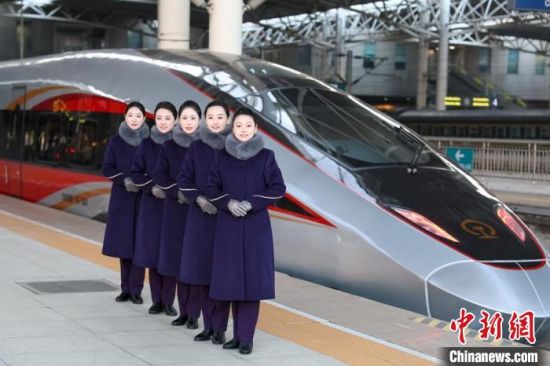 1月4日,在長(zhǎng)春站站臺(tái),列車(chē)乘務(wù)人員與“智能復(fù)興號(hào)”動(dòng)車(chē)組拍照留念。李鵬博 攝